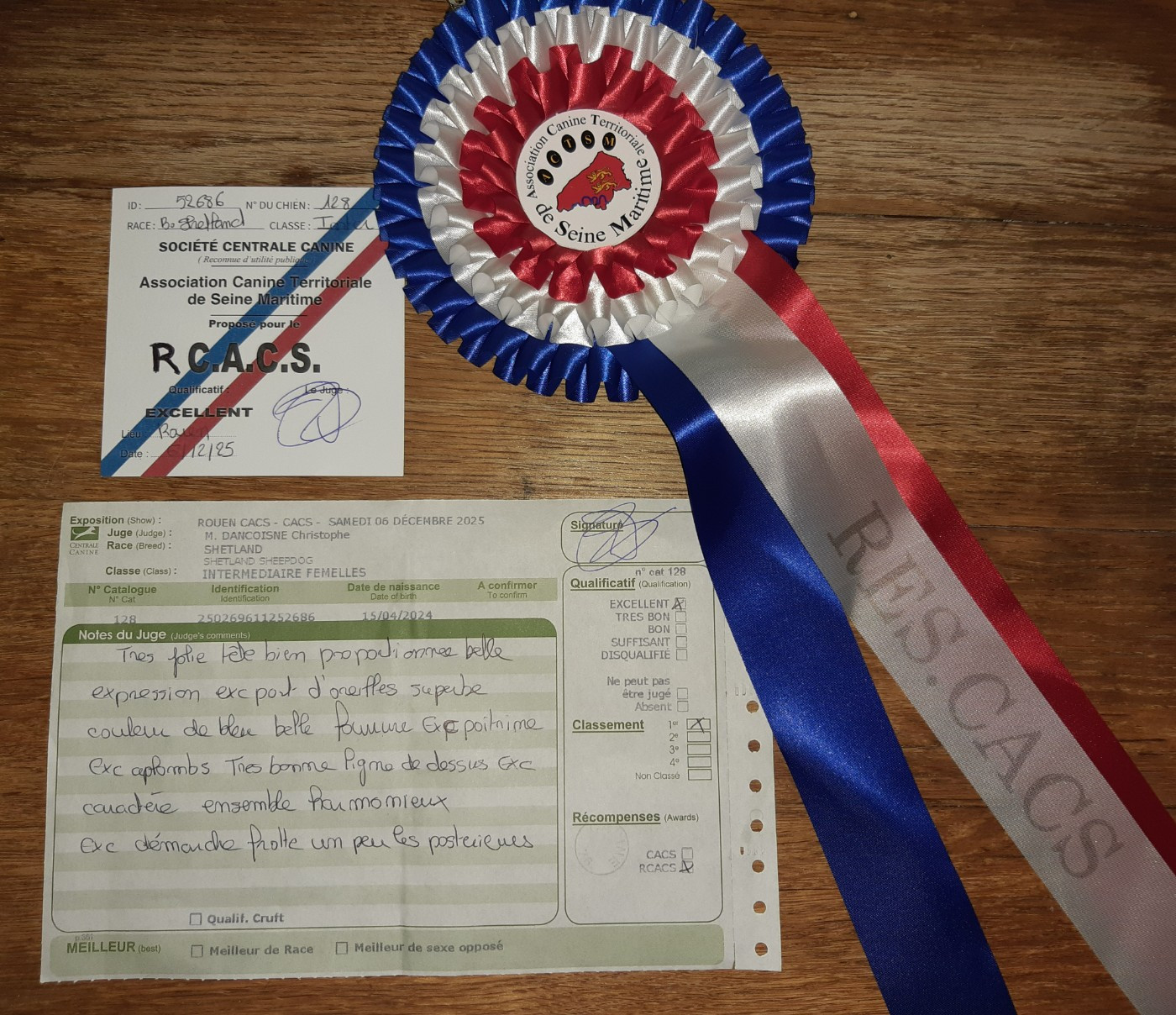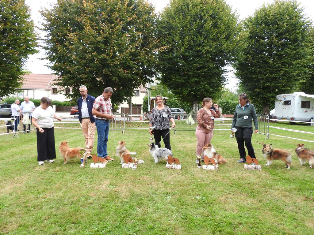 Très jolie tête bien proportionnée, belle expression, excellent port d'oreilles, superbe couleur de bleu, belle fourrure, excellente poitrine, excellent aplombs, très bonne ligne de dessus, excellent caractère, ensemble harmonieux, excellente démarche frotte un peu les postérieurs
